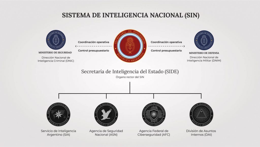 Se le agregan funciones de conducción y control presupuestario sobre la Dirección Nacional de Inteligencia Criminal y la Dirección Nacional de Inteligencia Militar, las que dependen respectivamente del ministerio de Seguridad y del de Defensa. Una suerte de “sistema nacional de inteligencia” que si bien no tiene un mando único si está dotado de un organismo rector.