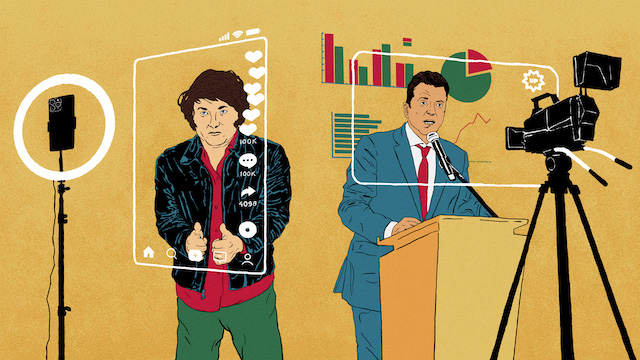 Milei es, antes que cualquier otra cosa, un influencer: una persona que se hizo conocida por sus performances públicas en televisión, que comenzaron hace siete años, y por su participación en redes. No se hizo conocido como político ni como economista, sino como un personaje de la comunicación. A medida que crecía, alrededor suyo se articuló una comunidad digital y política (que en algunos casos lo precedía). En tiempos de economía de la atención, lo que prima es el recorte y la capacidad de decir las cosas en poco tiempo y con contundencia. No es casual, entonces, que el ascenso de Milei haya cumplido con el efectismo que demanda la sociedad digital. El libertario cumple, además, con el prototipo del troll: descalifica a sus adversarios, sus insultos son variados y virales y arrasa el debate ante cualquiera que busque refutar sus argumentos. Los medios y las redes fueron y son su lugar de constitución. Milei está en los medios, pero, sobre todo, él mismo es un medio.